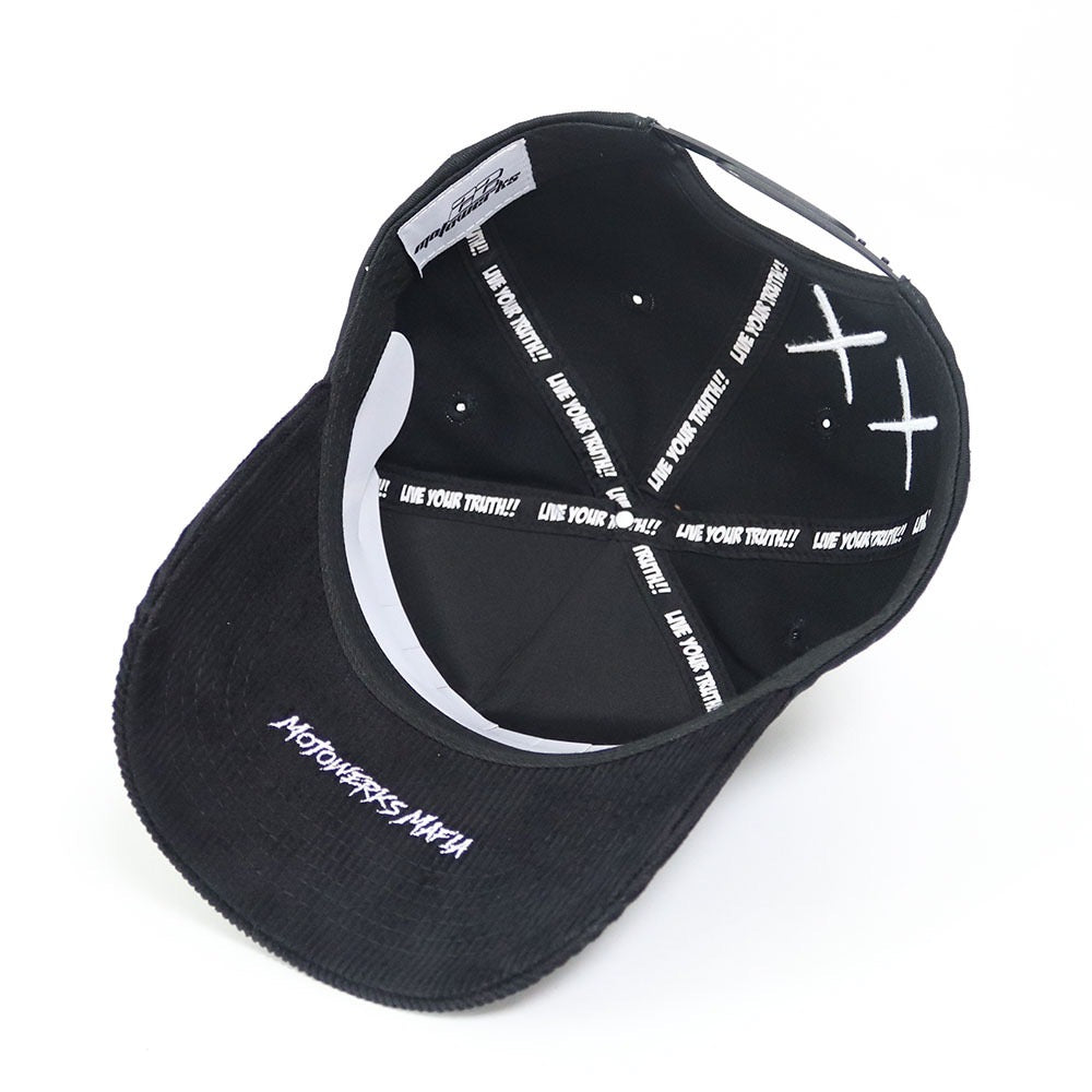 Complete your 'fit with the new black corduroy brim Snapback Hat from 22 Motowerks. This daily hat is complete with a curved brim, breathable eyelets, custom embroidery, and an adjustable snapback closure. Black front panel, black corduroy brim